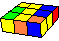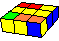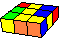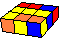 | In dieser Situation beginnt der erste Zug 'außerhalb' des 3-Ecken-Drehers. Das läßt sich daran merken, daß die erste zu wendende Kante auußerhalb dieses Systems liegt. Auch hier, wie dort, werden zuerst eine Ecke (links vorne, hier links unten) und eine Kante (die linke) gewendet. Gleichzeitig werden rechts und unten eine Ecke und eine Kante auf die Wiederholung der ersten Teilfolge vorbereitet. Wieder kann man die Lösung der beiden Teilfolgen auf die gegebene Situation projizieren: