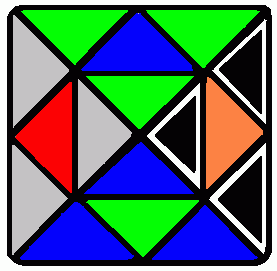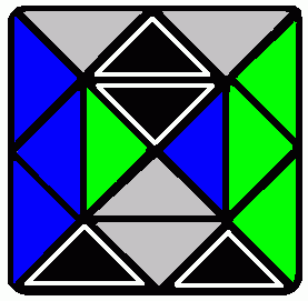 | | |   | This pattern is combined out twisting two corners opposite in space and two pair swaps of each four center stones: | | |                                                                    |  | In following pattern twisting corners is left: | | |                                  |  | The same as before, but one double pair swap of center stones is cycled by 90°: | | |                                  |  | From the first pattern in list the second sequence is excluded. This makes only one pair swap of center stones, in connection with the two twisted corners: | | |                                                      | | | This a more logic pattern. Left and right three centerstones are cycled anticlockwise: | | |                       | | | In the second an opposite change is initiated, which means that both cycles are running downward: | | |                       | | | | | | The opposite of those two can be constructed. Turn all arrows in the other direction, and the three-cycles are running backwarded. | | | | |   | Dieses Muster setzt sich zusammen aus dem Drehen zweier räumlich entgegengesetzter Ecken sowie zwei Vierertauschen von Mittelsteinen: | | |                                                                    |  | Beim folgenden Muster wird einfach das Eckendrehen weggelassen: | | |                                  |  | Nochmals die selbe Technik, doch ein Mittelsteintausch ist um 90° versetzt: | | |                                  |  | Vom ersten Muster in dieser Liste fehlt die zweite Folge. Das ergibt nur einen Paartausch von Mittelsteinen, in Verbindung mit zwei gedrehten Ecken: | | |                                                      | | | Hier ein eher logisches Muster. Links und rechts sind drei Mittelsteine im Gegenuhrzeigersinn vertauscht: | | |                       | | | In der zweiten Folge hier wird ein gegenläufiger Tausch initiiert, der darauf hinaus läuft, daß sich beide Zyklen nach unten bewegen: | | |                       | | | | | | Hiervon läßt sich auch das Gegenteil konstruieren. Kehren Sie die Pfeile um, und die Dreierzyklen laufen entgegen gesetzt. | | | |