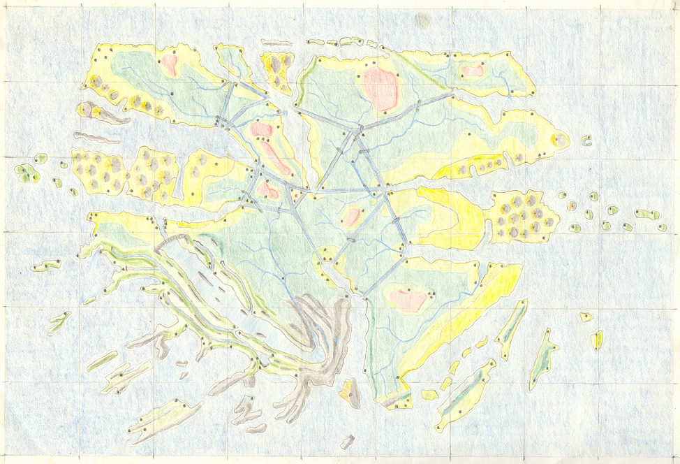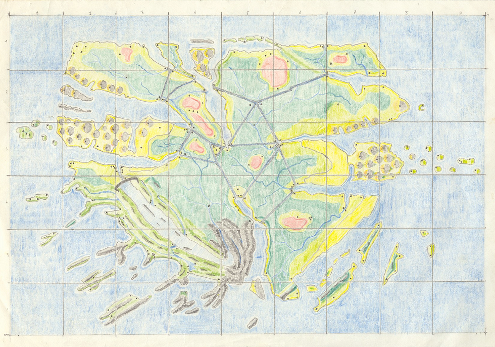 | | | Who is reminded to the Falkland-Islands, isn't wrong. With fourteen, fifteen years I was an interested paper-reader and news-watcher. So I was quite sure influenced by the shape of those troubled islands. But I've to confess, those islands of mine are inhabited by peaceful aliens, who travell across the galaxy and caring for love and peace. Their cities, here shown by spots, are parallel to this function the space-ships themselves. The brown hills are exploited because they consist of a high energy material, more energy-density than uranium or plutonium. This is the fuel of the spaceship-cities. Don't ask me why the continent Barvet needs canals to transport the "cities" allover the country. Perhaps the idea for the channels were influenced by those on mars, which never existed but in the fantasy of the newspapers. The islands in the north were created by the thaught of a visit of my sister to the East Frisian Islands. Vulcanos were inspired by Hawaii, but in this map the vulcanos of the islands are either inactive or afforested. And areas with vulcans are restricted, a kind of natural preserve. Even if there are cities within. The origin of the islands of the southwest is Norway. The flooded valleys must have been an ecological idea to produce clean energy by the citizen ;-) The islands in the southeast are thaughts of the malay archipel. Most canals are crossed by rivers, in a way like some channels are crossing rivers on a bridge. The triangle in the middle is clearly the seat of the government, signed by the red spot. This map was copied by me to the double size, afterwards to a map with a diagonal about 3 meters. All with crayon, pencil, calculator, dividers, set square, ruler. My wish to become a tracer wasn't fulfilled, and not the one to become cartographer :-( But this large map missed the color blue - I was too lazy to draw thos large, boring plains with only a crayon. So I cutted this paper away and overwent this heavy duty ;-) There is a funny story about measuring the land's surface. I thaught about using millimeter paper, and began to confer the contour - but had a better idea. Using poppy seed covering the whole paper, the idea was to suck it with a very special "vacuum cleaner": a glass closed by tinfoil. There were two straws in, one short, this was the one I pulled the air out of the glass, and a long one, bringing in the seed. This to clear the areas which were blue - the unneeded sea districts. And then measuring the volume of the seed covering the land regions. This would have lead to a reckonable volume and then to an approximate number of the paper covered by the seed. My caring mother thaught I was taking drugs - an unidentifiable tool with alloy and pipes, and the moon seed, well known as a base of opium and heroin - but only the callow form of it. I could appease her, but the lust to measure the surface of the land was gone. By the way, the whole planet is covered by water, water and only water. This avoided annoying conflicts with the neighbours ;-) | | | | Wer sich an die Falklandinseln erinnert fühlt, liegt da nicht falsch. Mit vierzehn, fünfzehn Jahren war ich ein interessierter Leser der Tageszeitung und sah auch immer die Abendnachrichten im Fernsehen. Auf diese Art war ich sicher von der Form dieser problembehafteten Inseln beeinflußt. Doch muß ich eingestehen, daß die Bewohner dieser Inseln von friedlichen Außerirdischen bewohnt werden, die durch die Galaxie reisen und sich um Liebe und Frieden kümmern. Ihre Städte, hier als schwarze Punkte angedeutet, waren überdies auch ihre Raumschiffe. Die braunen Berge werden ausgebeutet, da sie aus einem hochenergetischen Material bestehen, mit einer höheren Energiedichte als Uran oder Plutonium. Zugleich ist dies auch der Treibstoff der Raumschiff-Städte. Fragt mich nicht, warum Barvet Kanäle benötigt, um die "Städte" quer über das Land zu transportieren. Vielleicht entstand diese Idee aus den Kanälen auf dem Mars, die ohne Zweifel damals nur in der Fantasie einiger Zeitungen existierten. Die Inseln im Norden entstanden dadurch, daß meine Schwester einmal auf den Ostfriesischen Inseln zur Kur war. Vulkane wurden durch Hawaii inspiriert, doch in dieser Karte sind die Vulkane der Inseln entweder inaktiv oder bewaldet. Und Bereiche mit Vulkanen sind Sonderzonen, eine Art Naturpark. Auch wenn Städte innerhalb dieser Parks liegen. Der Ursprung der Inseln im Südwesten liegt in Norwegen. Die gefluteten Täler müssen eine ökologische Idee der Bürger zur Energiegewinnung gewesen sein ;-) Die Inseln im Südosten sind Gedanken an den malaiischen Archipel. Die meisten Kanäle werden von Flüssen gekreuzt, ähnlich wie bei uns Kanäle Flüsse überqueren. Das Dreieck in der Mitte ist ganz klar der Regierungssitz, der durch einen roten Punkt gekennzeichnet ist. Die Karte wurde von mir zur doppelten Größe übertragen, später dann zu einer noch grösseren Karte mit einem Durchmesser von über 3 Metern. Mein Wunsch, technischer Zeichner zu werden, wurde nicht erfüllt, und auch nicht der zum Kartographen :-(Doch dieser Karte fehlte die Farbe blau - ich war einfach zu faul, diese großen, langweiligen Flächen nur mit einem Buntstift auszumalen. Also schnitt ich dieses Papier einfach ab und überging diese lästige Pflicht ;-) Es gibt eine lustige Geschichte dazu, wie ich die Landfläche vermessen wollte. Zunächst dachte ich an Millimeterpapier, und begann auch, die Konturen auf solches zu übertragen - hatte dann aber eine bessere Idee. Indem ich Mohnsamen verwendete, um das Papier zu bedecken, wollte ich die Meeresflächen mit einem speziellen "Staubsauger" von der Mohnsaat befreien: einem Glas, das mit Aluminiumfolie verschlossen war. In diese stachen zwei Strohhalme, der mit dem kurzen Ende im Glas saugte die Luft an, der mit dem langen Ende saugte die Mohnsamen hinein. Dann hätte ich das Volumen der Mohnkörner gemessen und daraus dann die ungefähre Fläche berechnet, die der schwarze Mohnsame